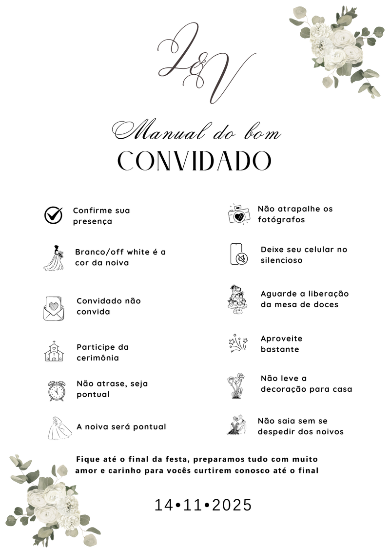 A noiva não se atrasará, e queremos que todos estejam acomodados com tranquilidade para vivermos juntos esse momento tão especial, desde a emocionante entrada até cada detalhe da celebração.